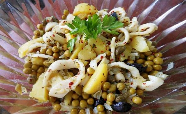 Тёплый салат с кальмарамиЛидаДата рыбалки: 15.10.21Рыба в рецепте: КальмарДанный рецепт заимствован мною у автора кулинарной
